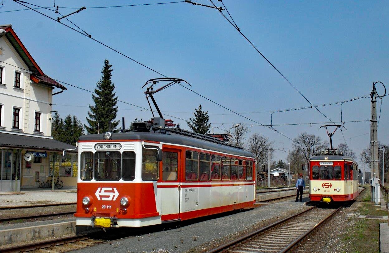 Bahnhöfe in Stadl-Paura, Zugkreuzung der Lokalbahn Lambach - Vorchdorf im heutigen Bahnhof Stadl-Paura mit 2 ehemaligen Triebwagen der Extertalbahn.