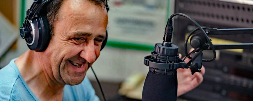 Erich Klinger im Studio von Radio FRO bei der Sendung "Wegstrecken".
