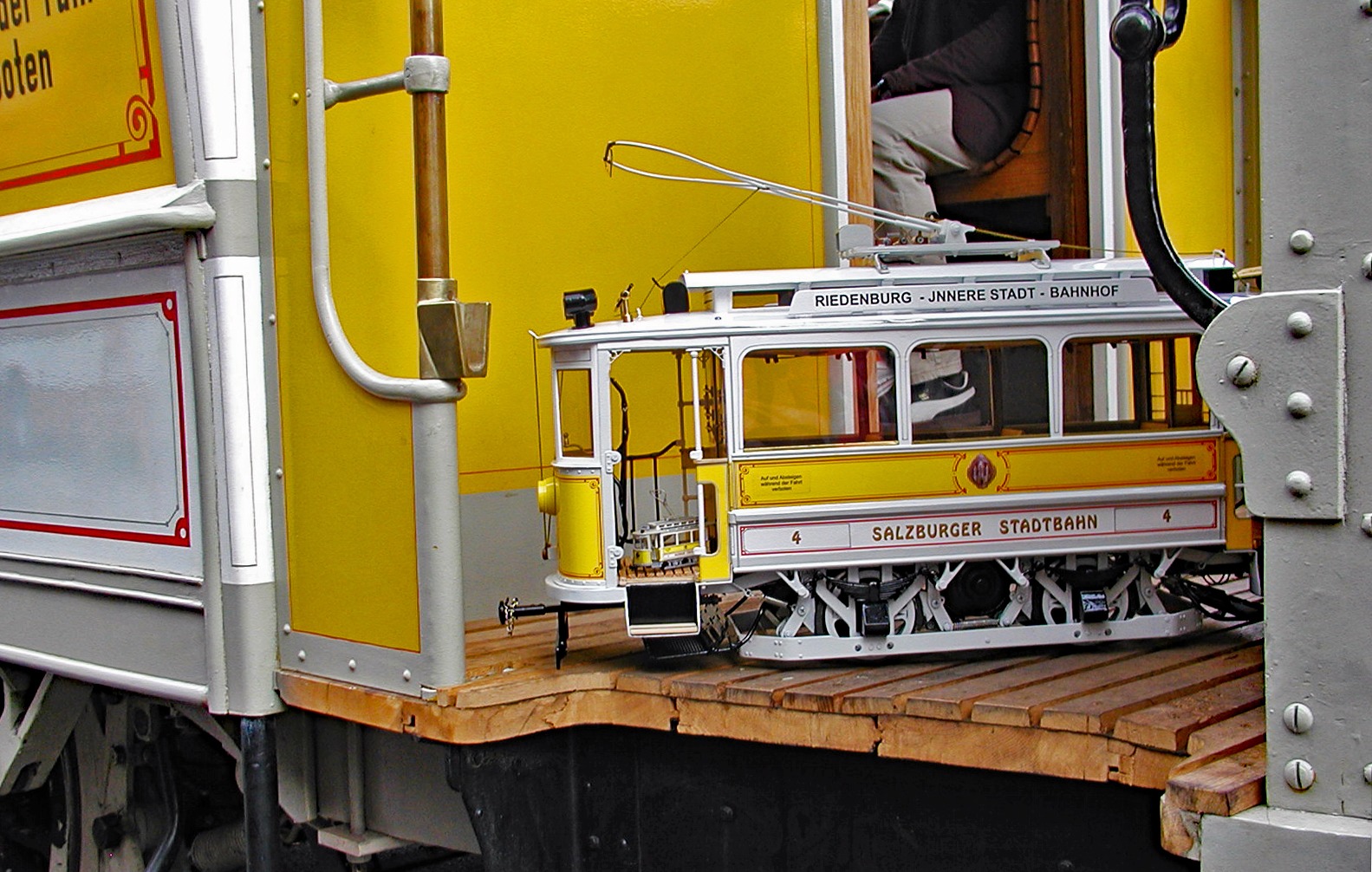 SETG Gelbe Elektrische Salzburger Lokalbahn, Modelle der Gelben Elektrischen auf der Trittstufe des Originalfahrzeuges (Nachbau Museums-Tramway Mariazell).