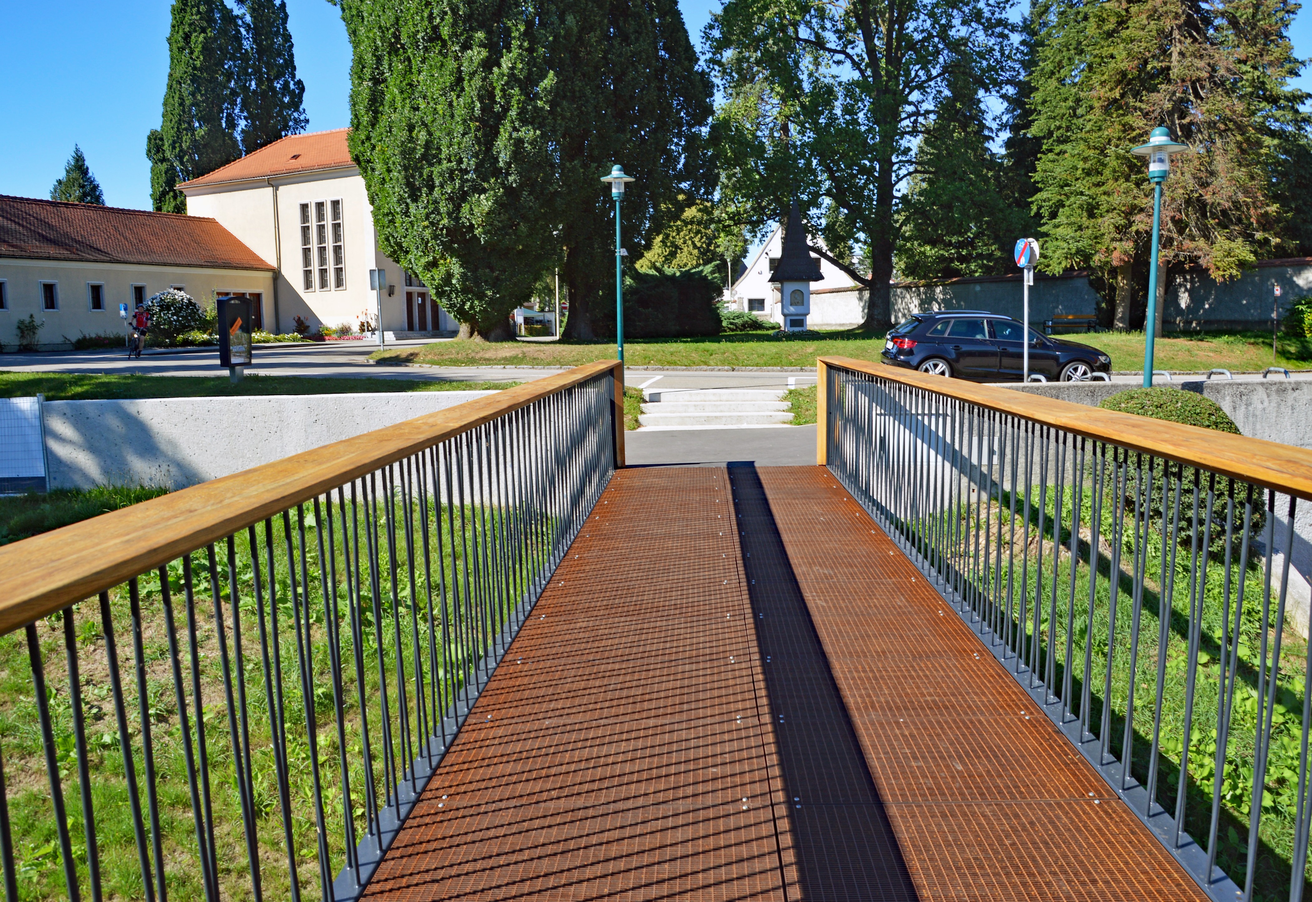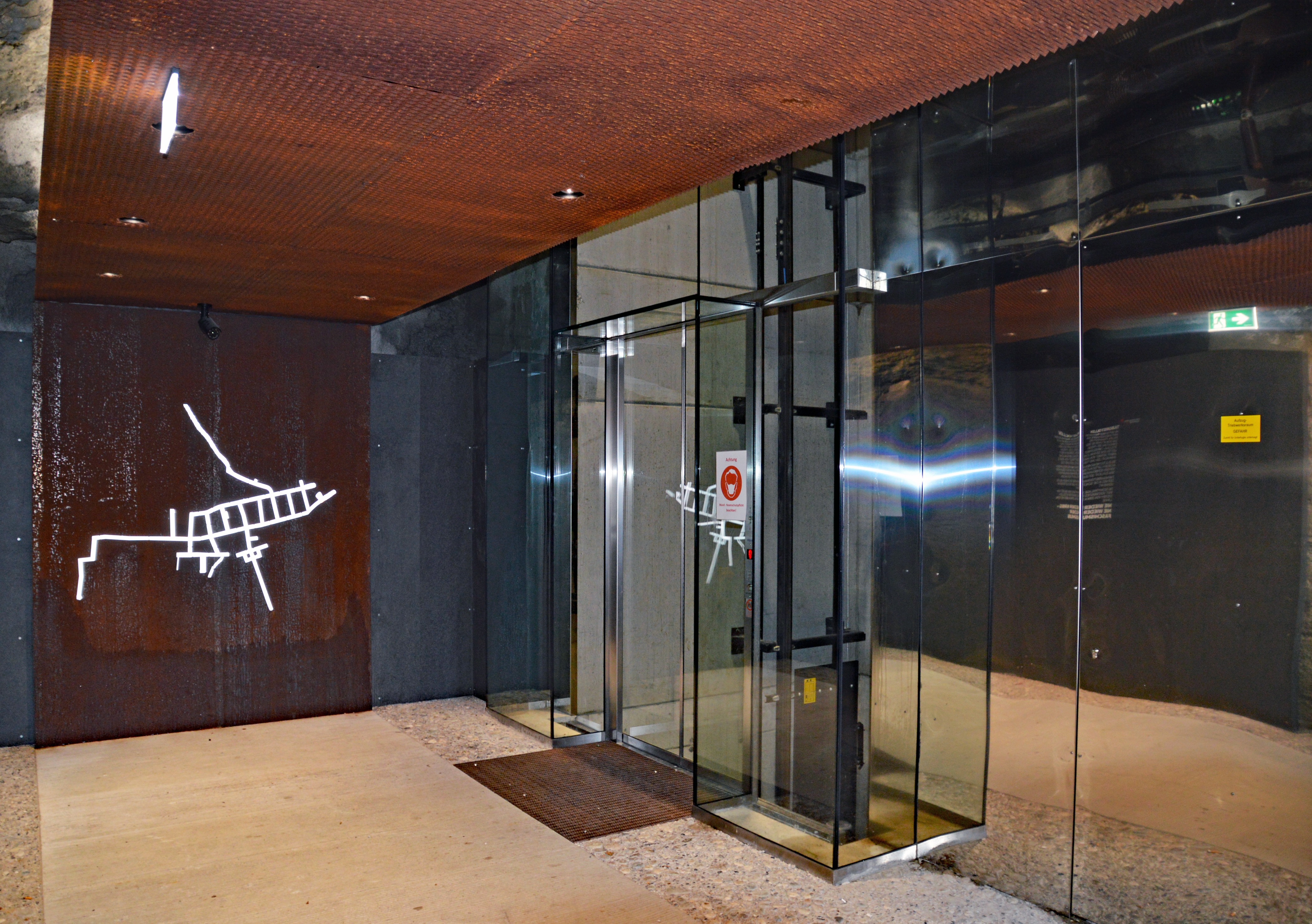 Es braucht einen konzentrierten Blick von der Zwischenbrücke zur Michaelerkirche und dem Restaurant Tabor-Turm am Berg, um den Lift zu sehen. Der Turm fügt sich perfekt in die Natur ein. Der Eingang nutzt einen früheren Luftschutzstollen.