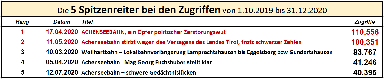 Die absoluten Spitzenreiter bei den Zugriffen der mehreren 100.000 interessierten User sind die bedauernswerten Ereignisse um die Achenseebahn, die vom Land Tirol in den Konkurs getrieben wurde und das Thema Verlängerung der Salzburger Lokalbahn von Lamprechtshausen nach Eggelsberg, die immer noch über 80.000 User zum Anklicken motiviert!