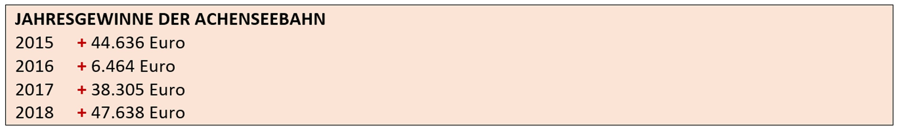 Die Achenseebahn hat von 2014-2018 in schwarzen Zahlen bilanziert und war auf dem besten Weg in die Zukunft eines modernen Nahverkehrsunternehmens, hätte das Land Tirol das, durch den Entzug der MIP-Mittel 2015-2019, nicht verhindert. Da ging es um 3,18 Mio. Euro, die durch die Nichtzahlung des Landes Tirol die Achenseebahn in die Insolvenz getrieben hat. Jetzt wird schon wieder, wie so oft, vom Land Tirol, die Behauptung aufgestellt, die Achenseebahn, unter angeblich neuem Eigentümer Zillertalbahn, weiter betreiben und dazu 3,1 Mio Euro vom Land Tirol bezahlen zu wollen.