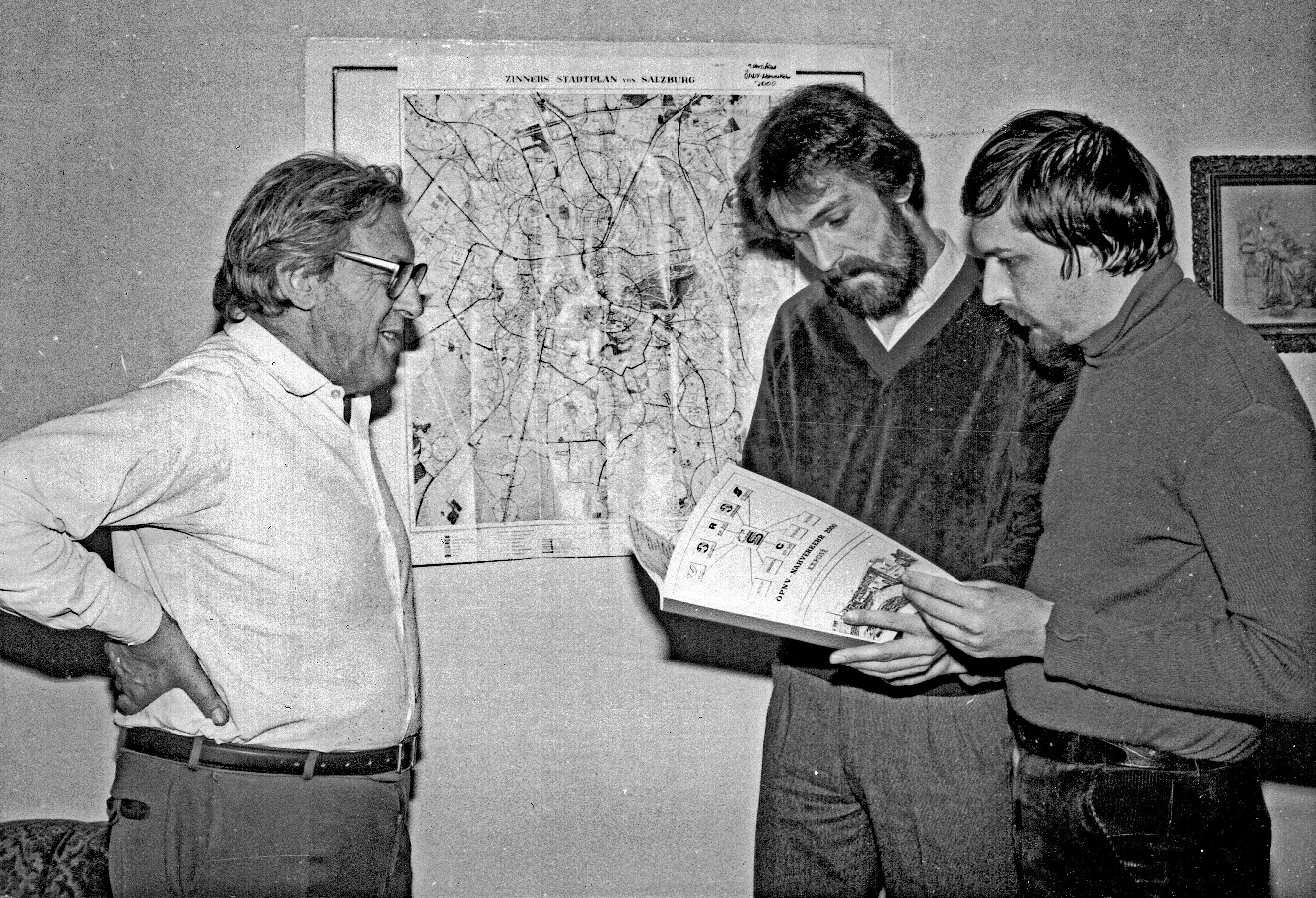 Das Team des privat erstellten Konzeptes "ÖPNV-Nahverkehr 2000" v.l. Alois Fuchs✝, Heinrich W. Lechner und Richard Fuchs im September 1981.