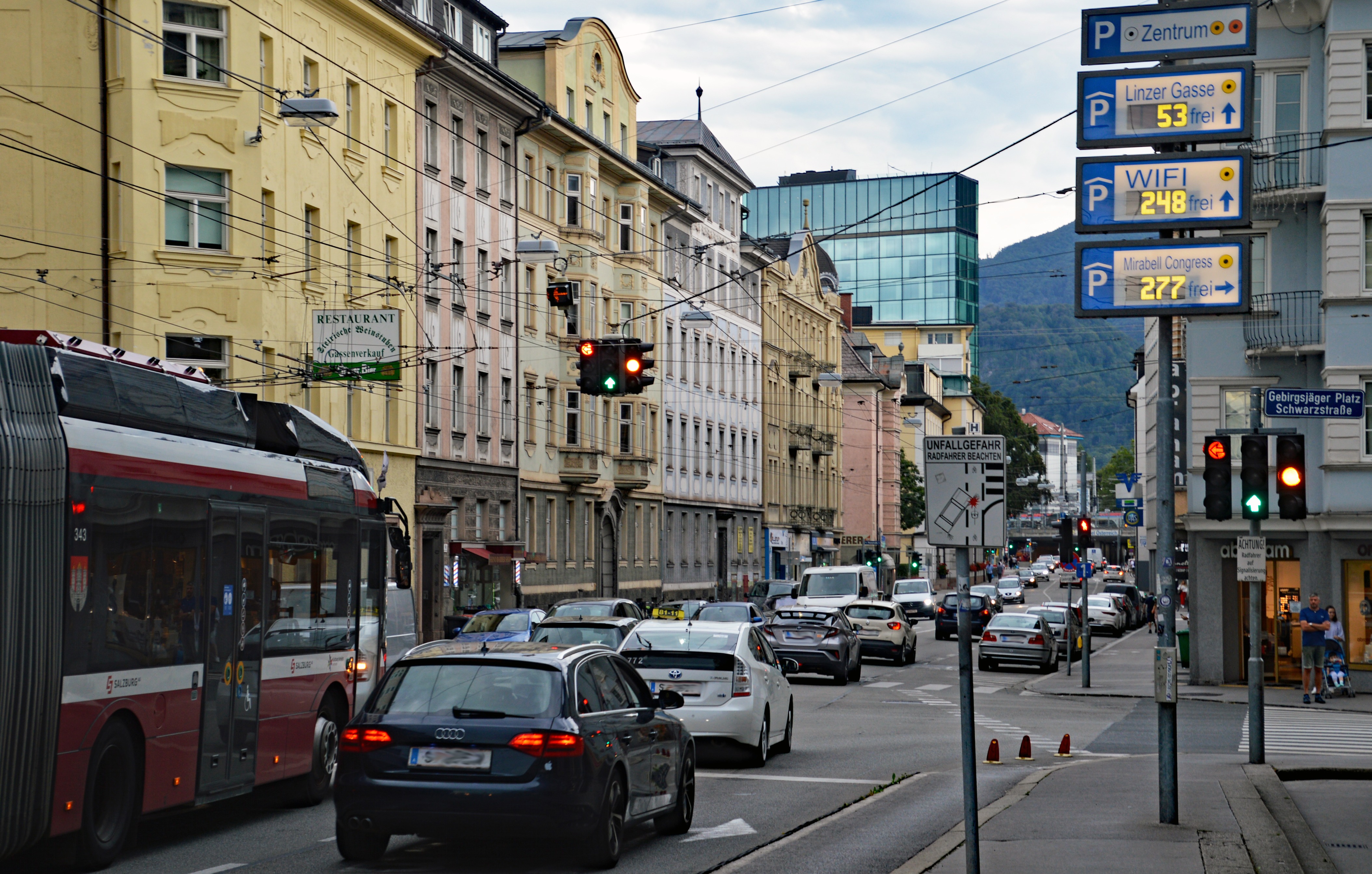 STAU in Salzburg, Lehener Brücke, Ignaz-Harrer-Straße, Saint-Julien-Straße; Garagenampel beim Gebirgsjägerplatz