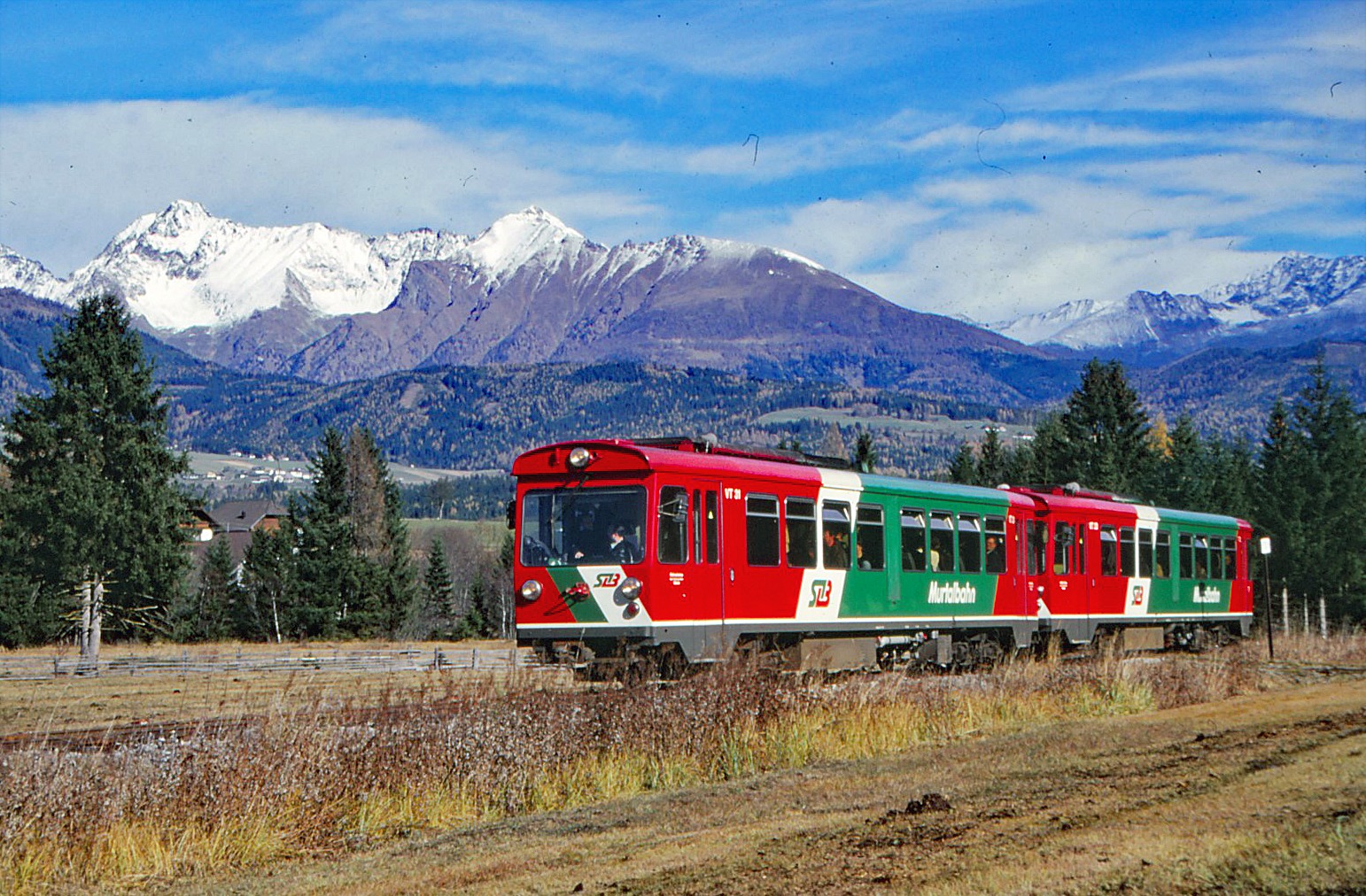 Links: VDV-TramTrain Visualisierung Pinzgauer Lokalbahn Mitte: Murtalbahn 1999 Sonderfahrt Triebwagen nach Mauterndorf kurz vor Mauterndorf. Rechts: Murtalbahn 1999 Sonderfahrt Triebwagen nach Mauterndorf im Bahnhof Mariapfarr.