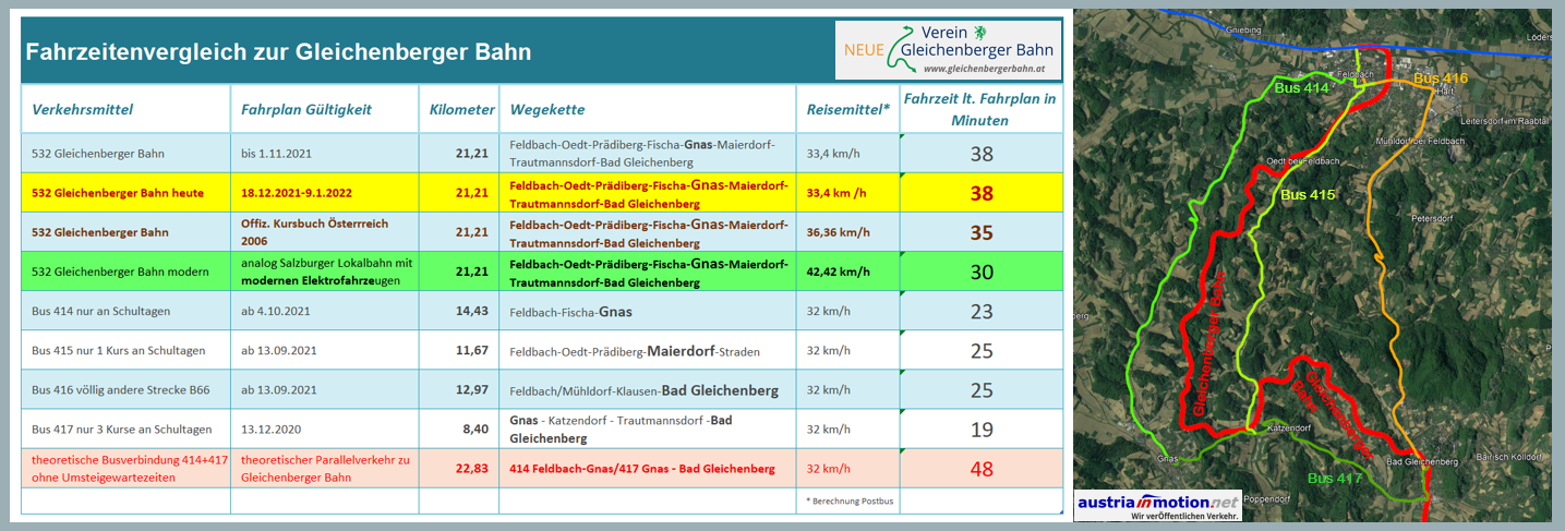 Zur Behauptung „…der Bus fährt schneller als die Bahn… “ hat man zwei Kunstgriffe verwendet: Erstens fährt der Bus den kürzeren Weg abseits der Orte und dort unter Negierung der meisten Haltestellen. Zweitens hat man einfach mit einer Geschwindigkeitsreduzierung der Gleichenberger Bahn die Fahrzeit um fast 8 Minuten künstlich erhöht und das mit den 90 Jahre alten Triebwagen. Würden auf der Strecke moderner Triebwagen, wie auf der Übelbacher Bahn, fahren, wäre eine Fahrt, mit Halt an allen Haltestellen, unter 25 Minuten möglich. Das wäre so, als würde man einem Marathonläufer die Beine zusammenbinden und sich über ihn lächerlich machen.