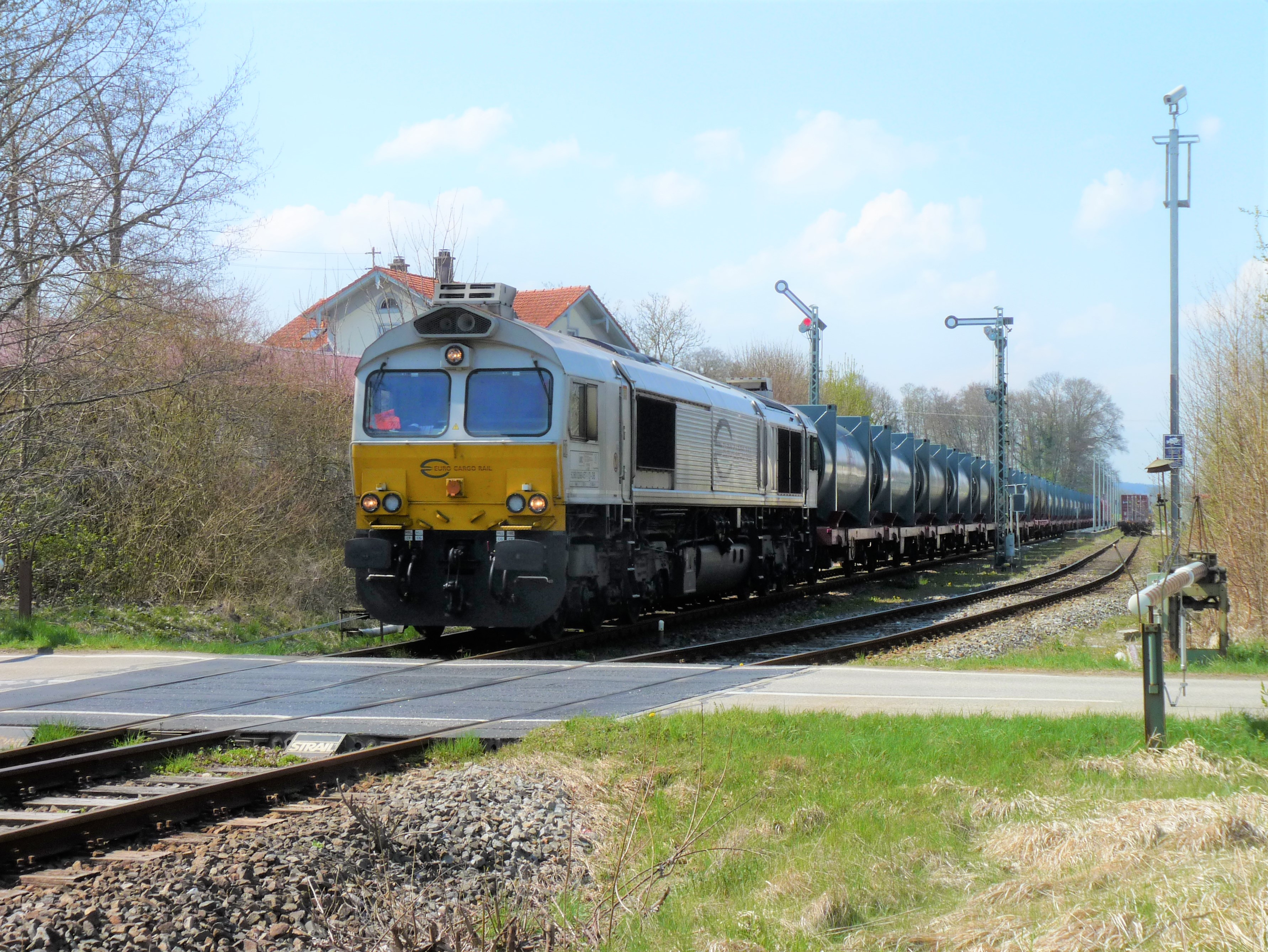 Zweigleisig ausgebaut wurde im Zug der ABS38 bisher nur der Abschnitt Ampfing - Mühldorf - Tüßling, hier ein Kesselwagenganzzug bei den Einfahrsignalen des Bahnhofs Tüßling