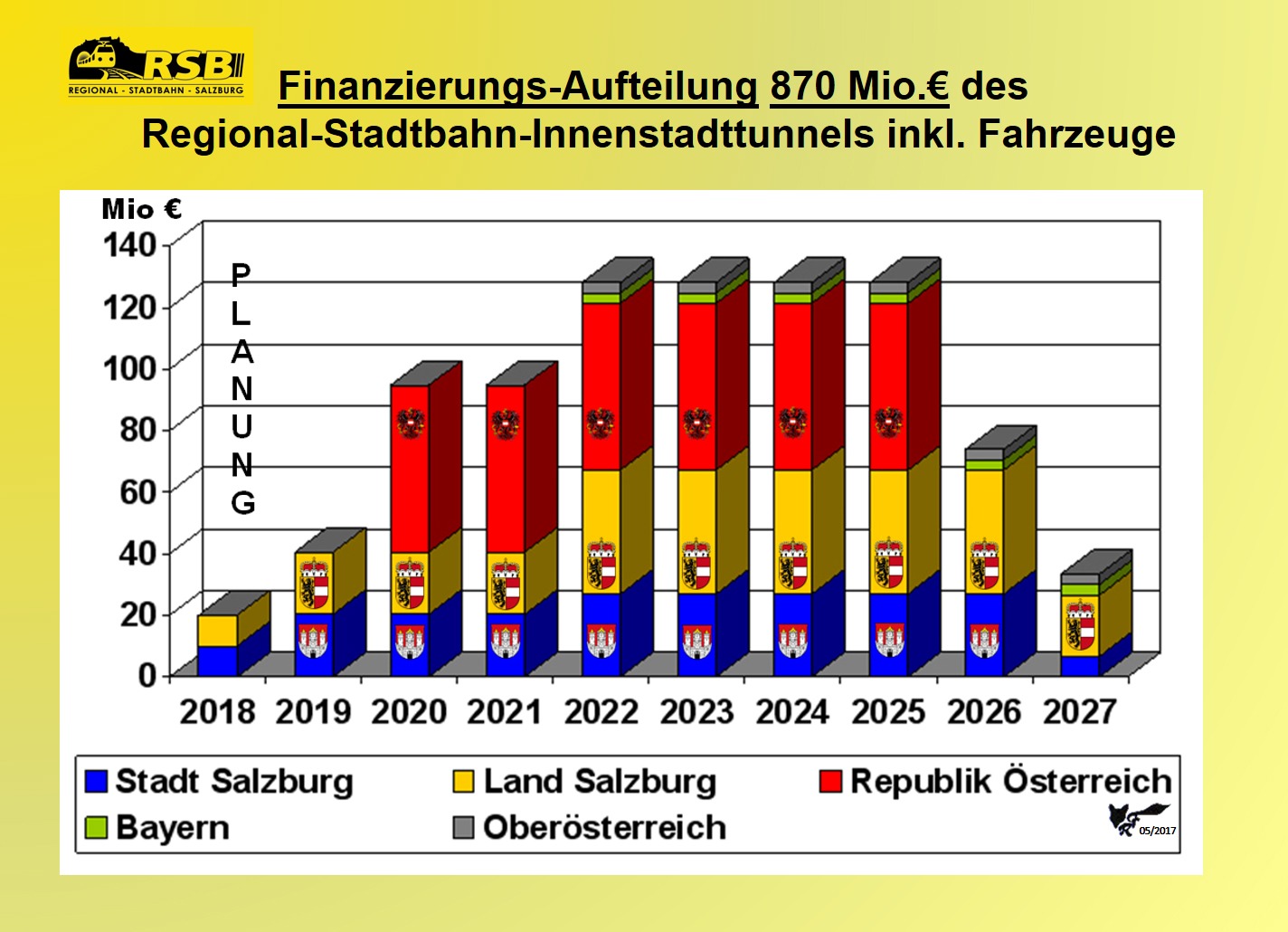 Im Jahr 2017 wurde vom Land Salzburg (Landesbau-Direktor) eine Finanzierungsprognose über 870 Mio. Euro, inklusive der notwendigen Fahrzeuge errechnet. Der Verein "Die Rote Elektrische" hat daraus auch die Anteile, zusätzlich zu den Bundesanteilen und denen von Stadt und Land Salzburg auch die Fahrzeugbeschaffung anteilig für Bayern (Königsseebahn) und Oberösterreich (Mattigtalbahn) errechnet und in einem 10-Jahres-Plan aufgezeigt. Abhängig von den Verbraucherpreis-Indizes und den Tariflohn-Indizes im Baugewerbe, können die Beträge zwar von der Berechnungsbasis 2017 abweichen, bewegen sich allerdings im überschaubaren Rahmen. Allerdings darf nicht vergessen werden, je länger mit dem Bau gewartet werden, umso mehr machen sich die Jahres-Indizes zunehmend bemerkbar!