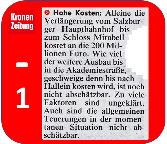 Der Begriff "Hohe Kosten" ist denkbar dehnbar und subjektiv. Wenn ich Schuhe für 5.000 Euro kaufe, sind das relativ "hohe Kosten". Wenn ich ein Auto kaufe für 5.000 Euro, dann sind das "niedrige Kosten" oder man nennt das "Schnäppchen". Wenn die öffentliche Hand den Porschehof, die Beamtenburg am Hauptbahnhof, für 220 Millionen renoviert, sind das relativ "hohe Kosten". Wenn der voll funktionsfähige Innenstadttunnel der Regionalstadtbahn, der S-Link", mit zwei Tunnelröhren und eine unterirdische Station bis zum Schloß Mirabell 200 Millionen Euro kostet, ist das angesichts von vergleichbaren Straßenbauten wohl die kostengünstigste Verkehrslösung für Salzburg, die man überhaupt bekommen kann.