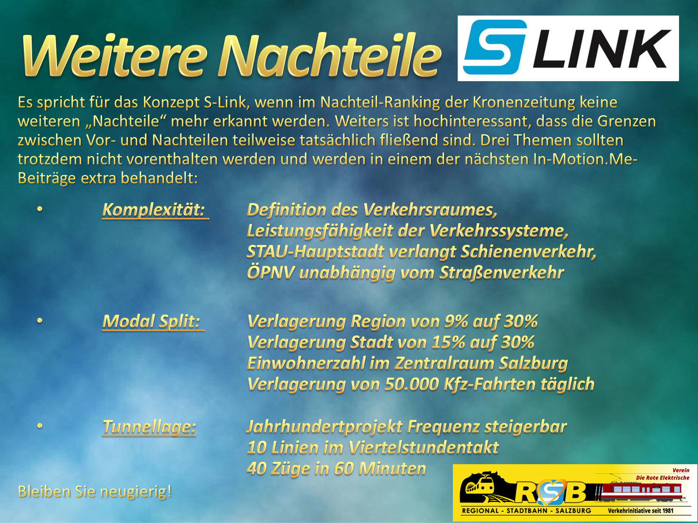 FAZIT: Das Regionalstadtbahn-Netz im Zentralraum Salzburg mit dem Herzstück der Mobilität unterirdisch durch die Stadt ist das Grundgerüst eines leistungsfähigen Schienenverkehrs-Netzes, das als einziges öffentliches Verkehrsmittel in der Lage ist, eine wirksame Verlagerung des Verkehrs weg vom Autoverkehr hin zum Schienen-Personennahverkehr SPNV zu ermöglichen. Nun haben wir die in der Kronenzeitung genannten Nachteile des "S-Link", der dort fälschlicherweise "Mini-U-Bahn" genannt wird, bewertet und korrigiert. Einige weitere Argumente, die dem Bereich "Nachteile" zuzuordnen sind, werden in einem der nächsten In-Motion.Me-Artikel genauer beschrieben. Siehe dazu die Stichwortliste "weitere Nachteile" weiter unten und bleiben Sie bis dahin neugierig!