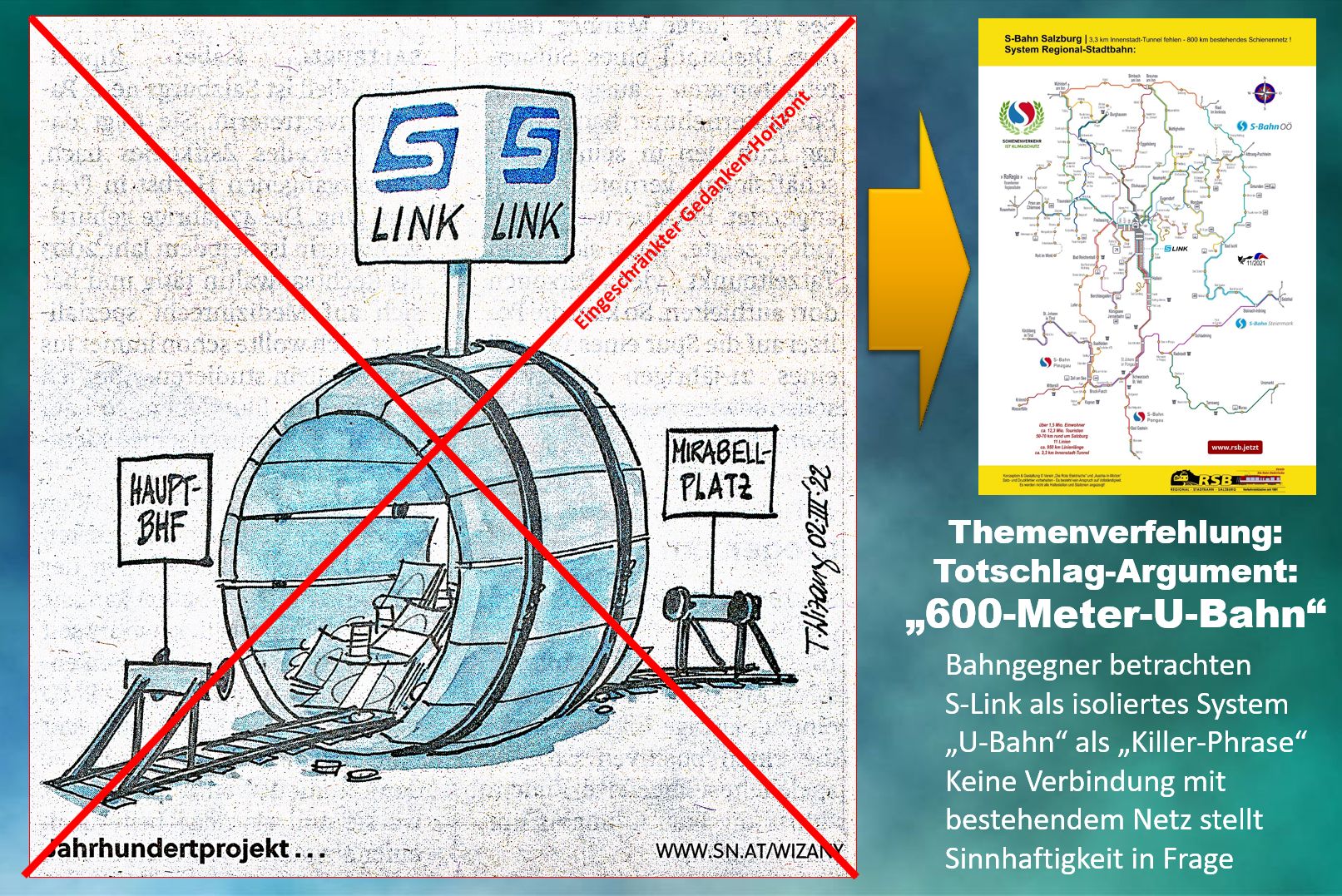 Dass der S-Link und die Flughafenbahn als gegensätzliche Projekte betrachtet werden, ist der Irrmeinung der "600-Meter-U-Bahn Hauptbahnhof - Mirabellplatz" geschuldet, die in einer medialen Denkblase gefangen ist, die nichts mit der Realität zu tun hat. Der "S-Link" ist das "Herzstück der Mobilität" im Zentralraum Salzburg und Inner Gebirg, das alle S-Bahnlinien in der Innenstadt bündelt. Eine dieser neu zu errichtenden Stadtbahn-Linien ist die kombinierte Flughafenbahn mit der Messebahn, die eine der Zulaufstrecken für den "S-Link"-Innenstadttunnel ist. Bereits heute gibt es drei Eisenbahn-Zulaufstrecken aus Bayern nach Salzburg. Vier bestehende Eisenbahn-Zulaufstrecken nach Salzburg kommen aus Österreich, inklusive der oberösterreichischen Mattigtalbahn. die derzeit modernisiert und elektrifiziert wird. Alle diese Eisenbahnstrecken, von denen bereits heute knapp 800 Kilometer existieren, werden im S-Link-Tunnel, unterirdisch unter der Landeshauptstadt Salzburg, gebündelt.