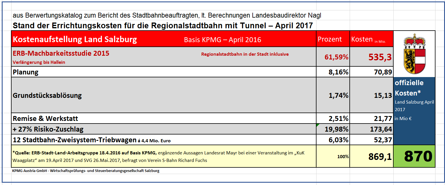 Kostenaufstellung Land Salzburg Basis KPMG – April 2017 Stand der Errichtungskosten für die Regionalstadtbahn mit Tunnel