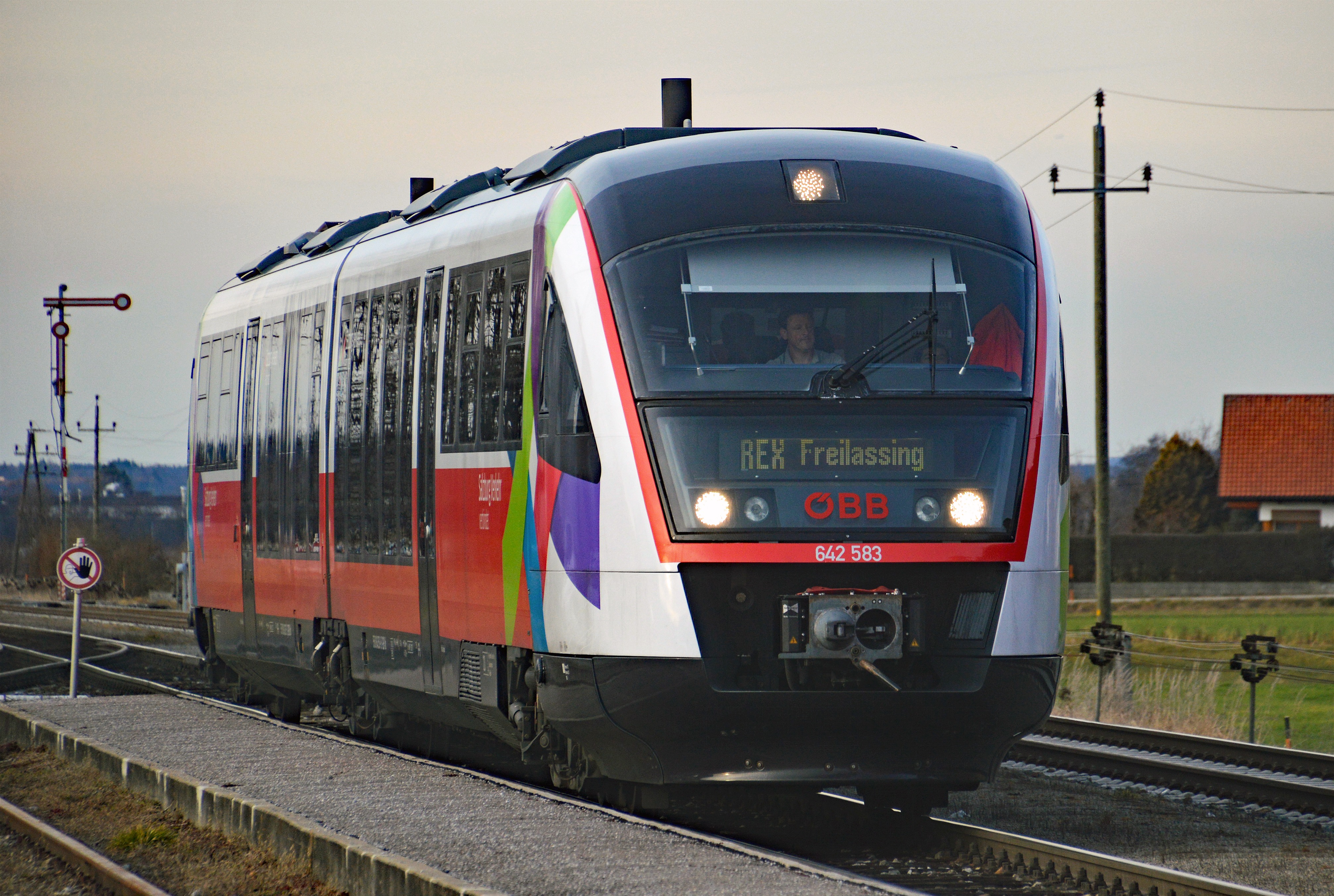 Für wenige Tage verschlug es den „originalen“ ÖBB Diesel Desiro 5022.25 aus Villach ins Innviertel und in den Flachgau, hier bei der Einfahrt in den Bahnhof Munderfing mit Formsignalen und mechanischen Schrankenanlagen.