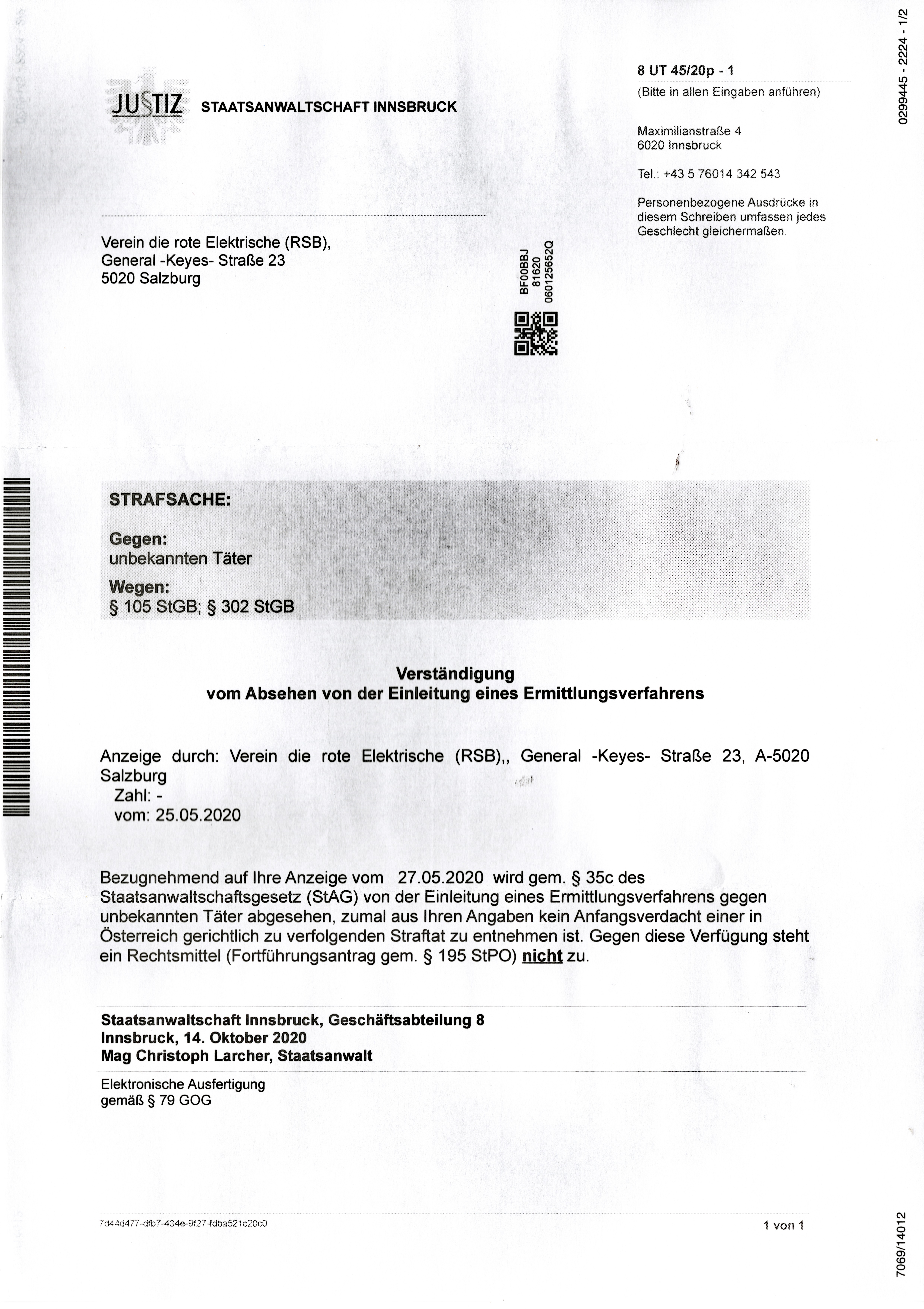 Brief Staatsanwaltschaft Innsbruck Ablehnung