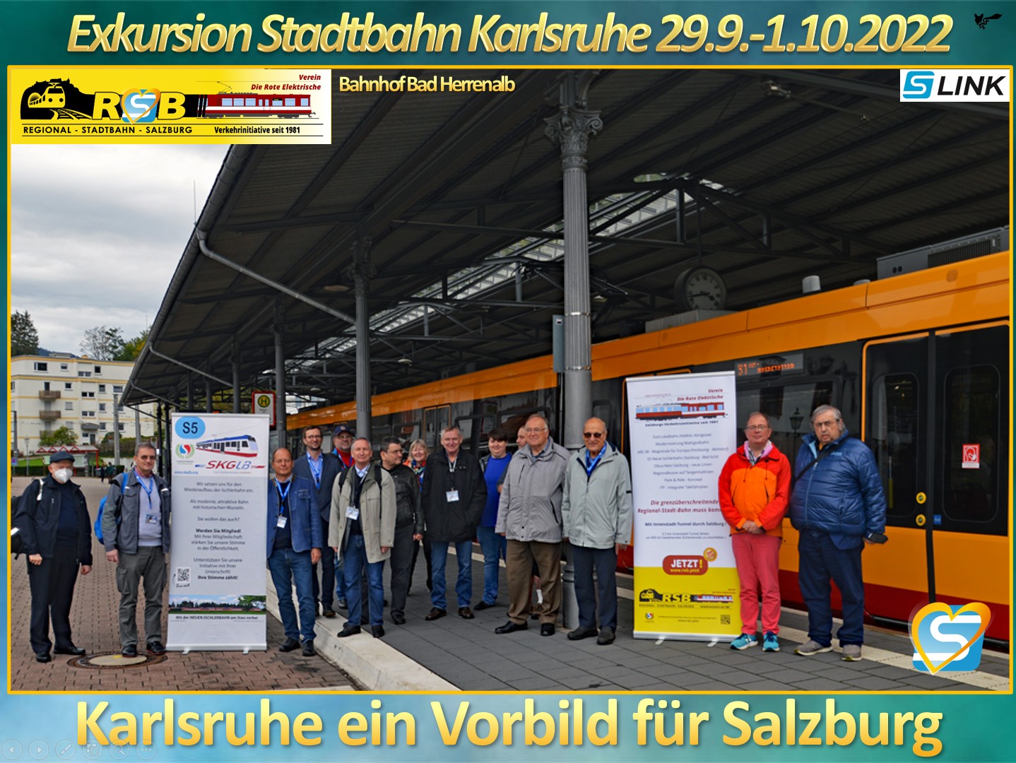 Gruppenbild Exkursion Stadtbahn Karlsruhe 2022 Bad Herrenalb. v.l.: Andreas Müller AVG, Günther Gritsch Club Salzkammergutlokalbahn, LAbg. Alexander Rieder FPÖ-Land Salzburg, LAbg. Hermann Stöllner FPÖ-Land Salzburg, Peter Oberascher Club Salzkammergutlokalbahn, Wilhelm Mack Kundenbeirat Südostbayernbahn, Mag. Georg Fuchshuber BVO-Salzburg, Martha Teufl Club Salzkammergutlokalbahn, Mathias Aigner VIDA Eisenbahnergewerkschaft, Andreas Dobroka in-Motion.me, (verdeckt) Gregor Watzl in-Motion.me, Mag. Markus Lechner Aktionsgemeinschaft Rote Elektrische, Erwin Pamp Verein "Die Rote Elektrische", Dipl.-Ing. Hans-Georg Frantz FH Kapfenberg/BIM Graz, Richard Fuchs Obmann Verein "Die Rote Elektrische", Gründer Verein "Neue Gleichenberger Bahn" sowie 2. Vorsitzender Verkehrsforum Berchtesgadener Land & Rupertiwinkel.
