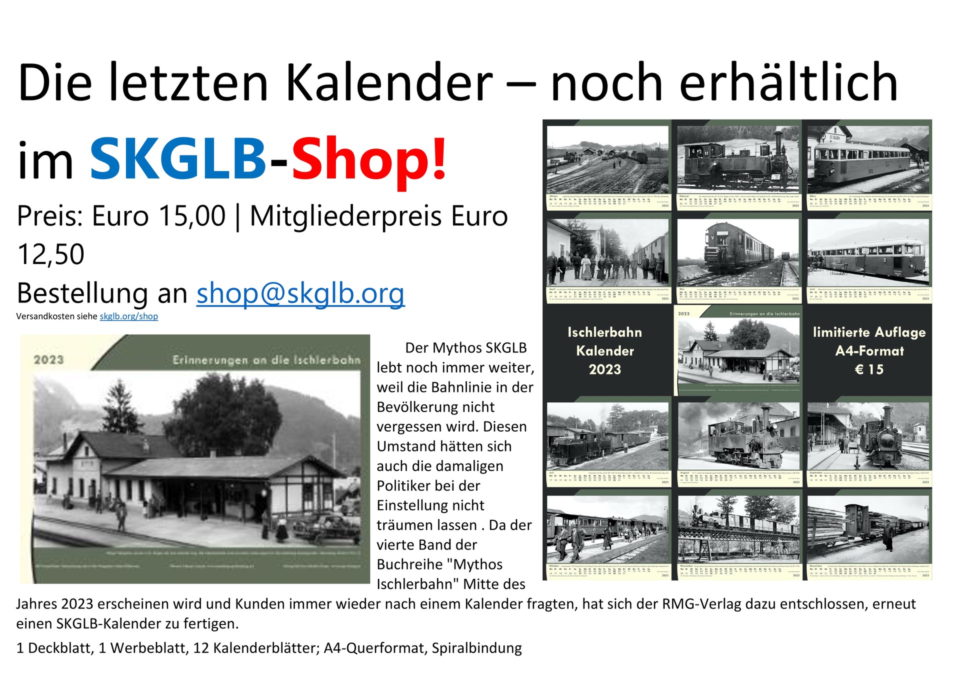 Der Mythos SKGLB lebt noch immer weiter, weil die Bahnlinie in der Bevölkerung nicht vergessen wird. Diesen Umstand hätten sich auch die damaligen Politiker bei der Einstellung nicht träumen lassen. Da der vierte Band der Buchreihe "Mythos Ischlerbahn" Mitte des Jahres 2023 erscheinen wird und Kunden immer wieder nach einem Kalender fragten, hat sich der RMG-Verlag dazu entschlossen, erneut einen SKGLB-Kalender zu fertigen.
