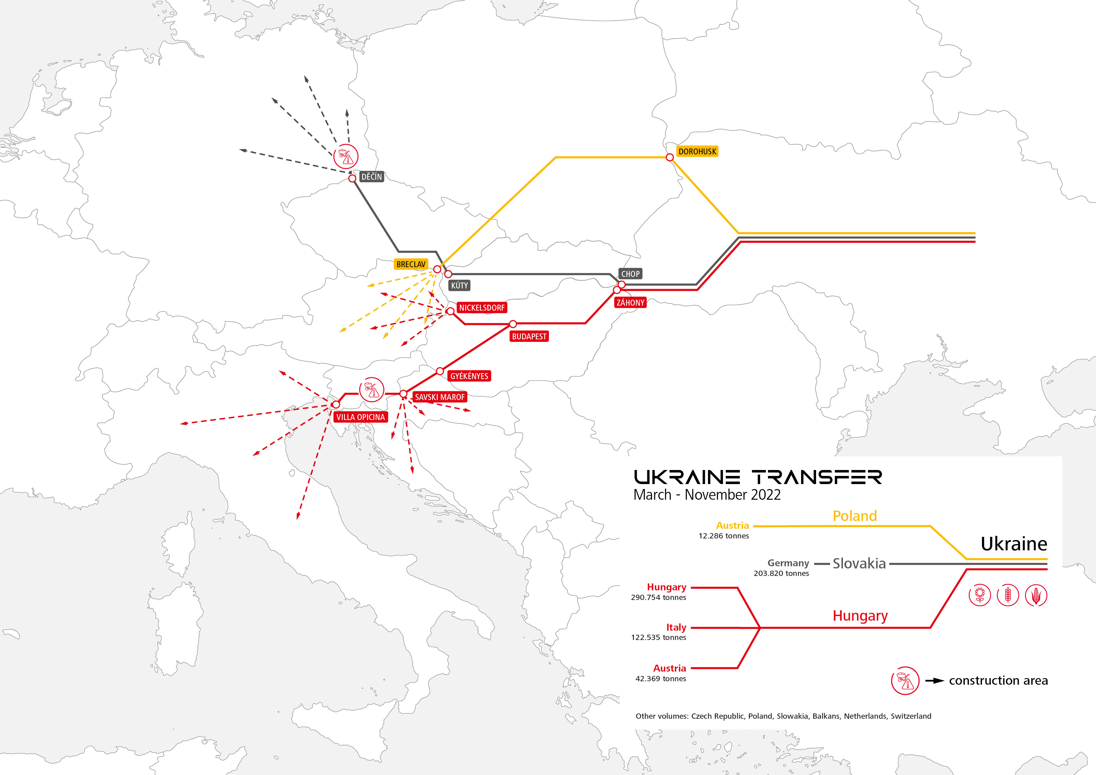 Laut den der RCG vorliegenden Informationen ist die ÖBB Güterverkehrstochter damit europaweit führend. Pro Monat beträgt das Transportvolumen zwischen 100.000 und 150.000 Tonnen. Dabei handelt es sich hauptsächlich um Getreide und Mais gefolgt von Zucker und Ölraps. Die Hauptabnahmeländer sind Ungarn und Deutschland, gefolgt von Italien und Österreich. Die Mengen bzw. die Güterströme seit März sind der Grafik im Anhang zu entnehmen.