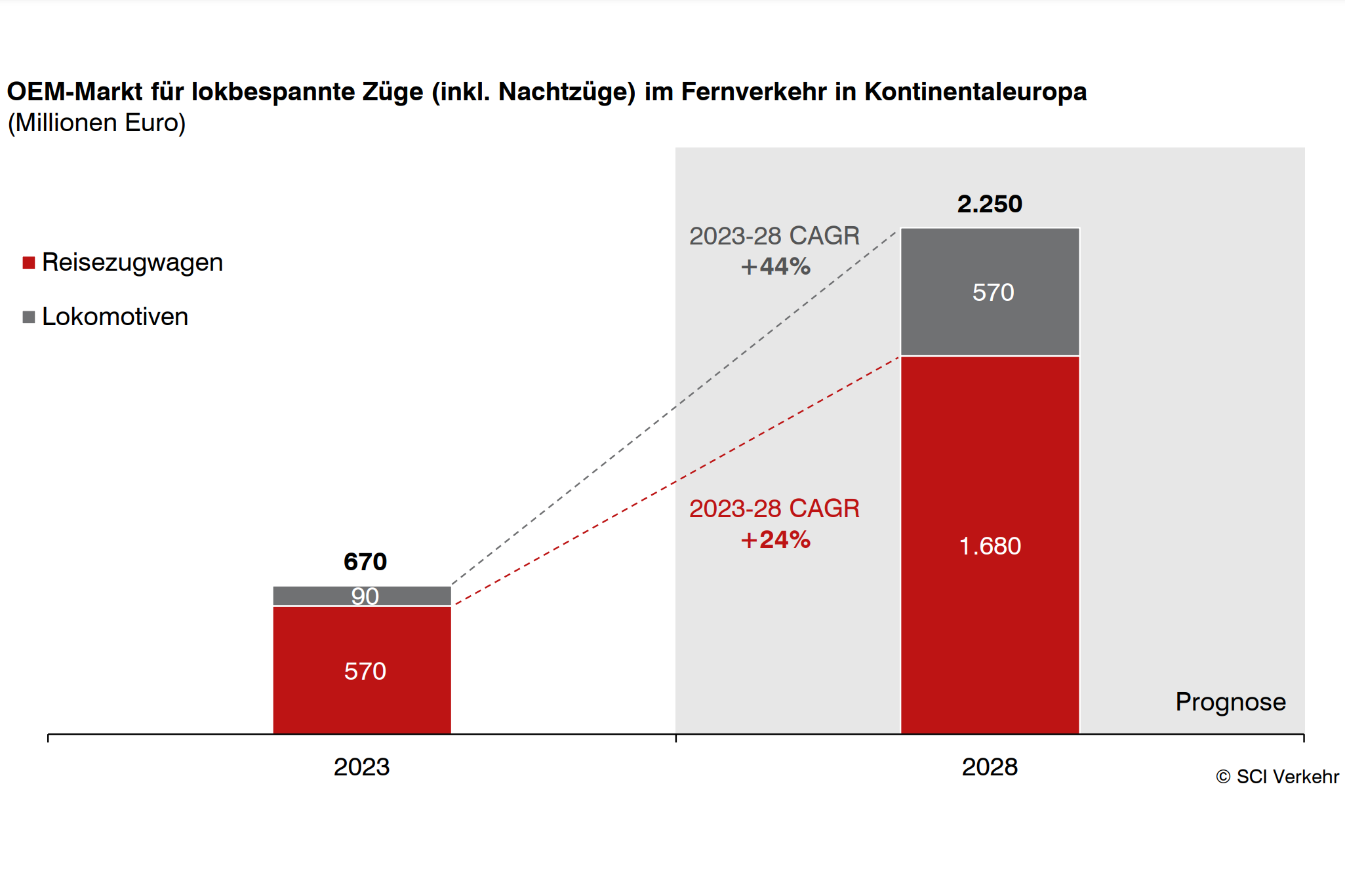 Mit politischer Unterstützung werden immer mehr Investitionen in die Infrastruktur und Ausrüstung der wichtigsten Korridore getätigt, das European Train Control System (ETCS) ist dabei nur eines der ambitionierten Projekte. Ziel ist ein nahtloser, zuverlässiger und komfortabler Schienenverkehr zwischen den europäischen Metropolen. Die Hersteller von rollendem Material haben dieses Potential erkannt und setzen auf moderne Intercity-Lokomotiven mit verschiedenen Länderzulassungen und Reisezugwagen mit Geschwindigkeiten von 200 km/h und mehr. So prognostiziert SCI Verkehr, dass der Markt für neue lokbespannte Intercity-Züge (einschließlich Nachtzüge) zwischen 2023 und 2028 mit einer außergewöhnlich hohen jährlichen Wachstumsrate von +27,6 % wachsen wird. Neben den Staatsbahnen, die ihrerseits neue Bestellungen gemacht haben, wird der Markt gerade auch für OpenAccess-Betreiber interessant. Um mit DB Fernverkehr konkurrenzfähigzu bleiben, wird beispielsweise FlixTrain in neue lokbespannte Zugflotten investieren müssen.