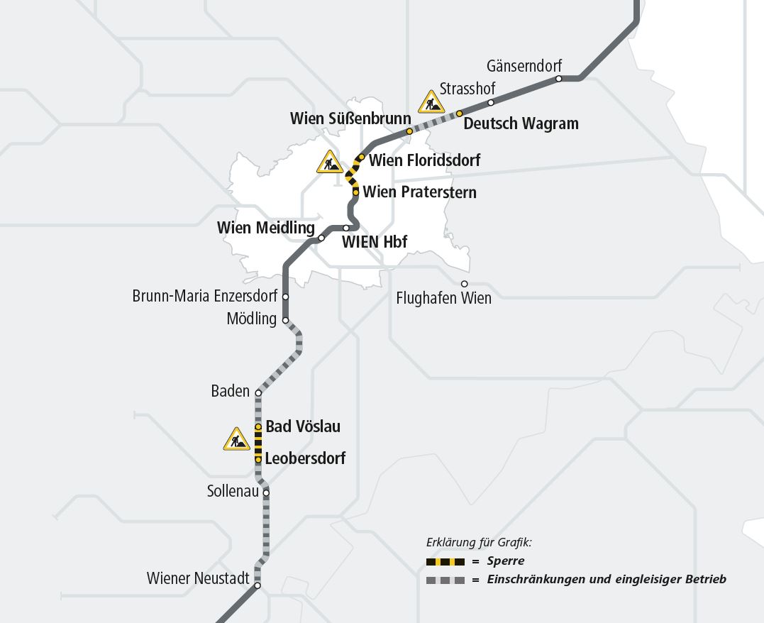 Um Fahrgäste auch in Zukunft zuverlässig und komfortabel an ihr Ziel zu bringen, modernisieren die ÖBB zahlreiche Strecken und bautechnischen Anlagen in der Ostregion bis Ende 2027 umfassend. Die notwendigen Bauarbeiten finden besonders in den Sommermonaten statt, um frequenzschwächere Zeiten – bedingt durch Urlaub und Ferien – zu nutzen und möglichst wenige Fahrgäste in ihren täglichen Wegen zu beeinträchtigen. Im Zeitraum von 29. Juni bis 2. September 2024 gilt deshalb auf einigen Bahnstrecken in Wien und Niederösterreich ein neuer Fahrplan. Es werden zeitgleich drei Teilabschnitte der Nord-Süd-Achse (Nordbahn, S-Bahn Stammstrecke, Südstrecke) ganz oder teilweise gesperrt. Zwischen Wien Floridsdorf und Wien Praterstern fahren keine Züge. Außerdem ist die Südstrecke zwischen Leobersdorf und Bad Vöslau unterbrochen.