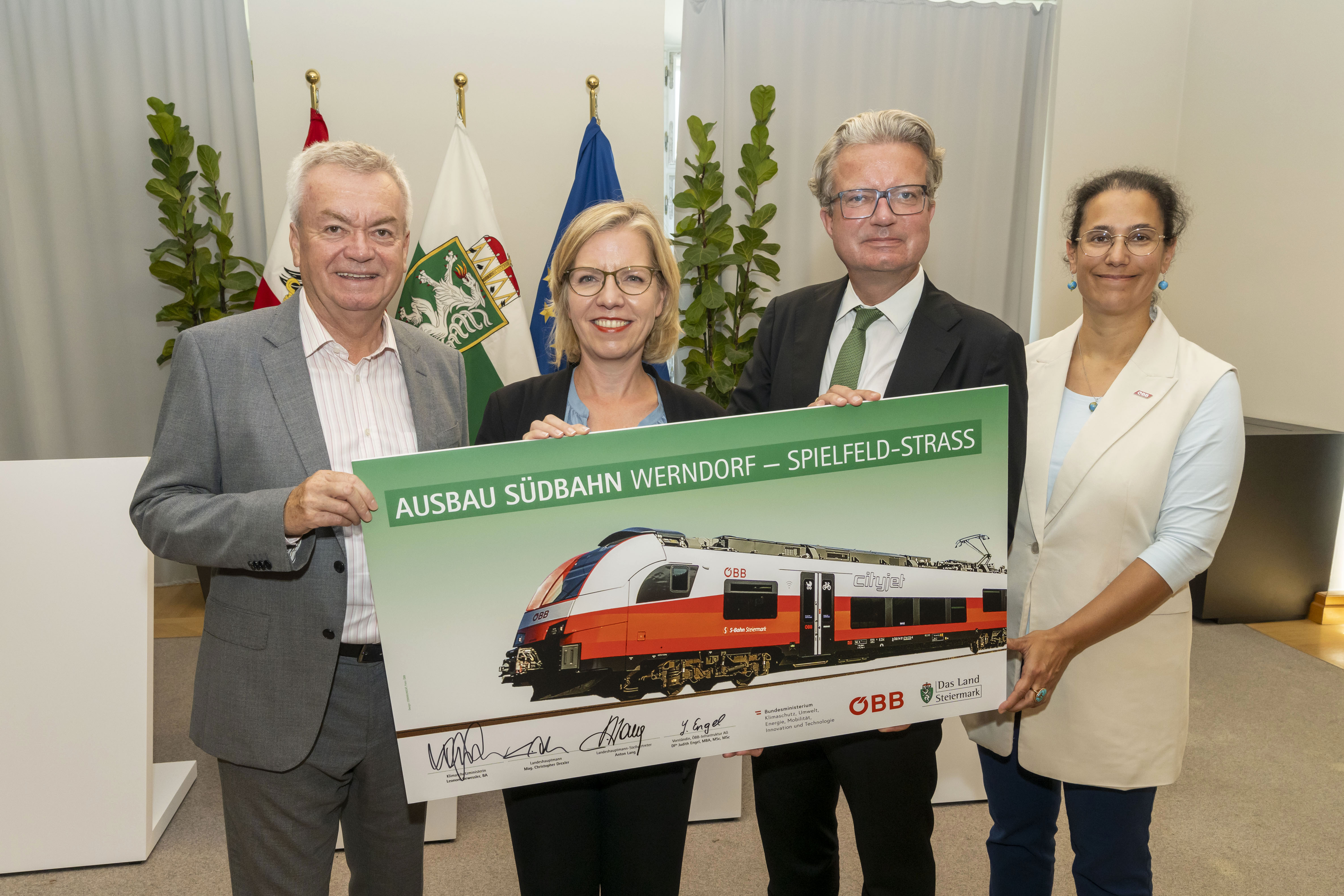 Die Südsteiermark wird fit für die Zukunft. Unter diesem Motto kamen heute Klimaschutzministerin Leonore Gewessler, Landeshauptmann Christopher Drexler, Landeshauptmann-Stellvertreter Anton Lang und ÖBB-Infrastruktur Vorständin Judith Engel in Graz zusammen, um eine gemeinsame Absichtserklärung zum Ausbau der Südbahn zwischen Werndorf und Spielfeld-Straß zu unterzeichnen. Bis voraussichtlich 2036 wird die Bahnstrecke durchgehend zweigleisig ausgebaut. Darüber hinaus werden Bahnhöfe modernisiert und Eisenbahnkreuzungen aufgelassen.