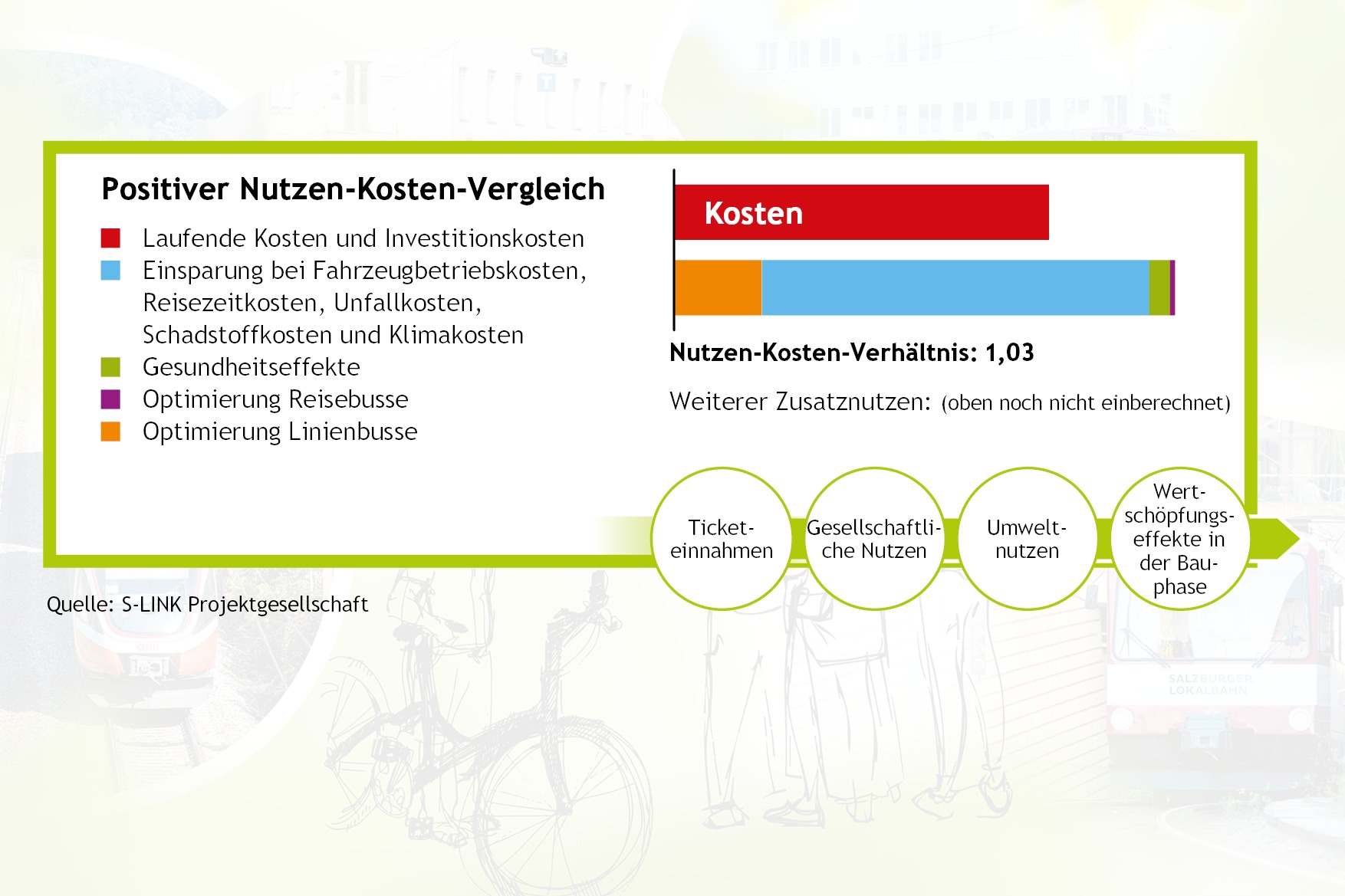 Der S-Link, also die unterirdische Verlängerung der S-Bahn bis Salzburg Süd und oberirdisch weiter bis nach Hallein bleibt bei der Salzburger Mobilitätslösung das Herzstück. Ohne ihn wären alle weiteren Streckenäste im Sinne der angestrebten Verkehrsentlastung nicht möglich. Er sorgt für die Nord-Süd Querung und ermöglicht durch seine Unabhängigkeit vom Verkehr in der Stadt über ihm die Pünktlichkeit und Verlässlichkeit der Öffis. Zudem entsteht an der Oberfläche auch mehr Platz für Fußgänger und Radfahrer.