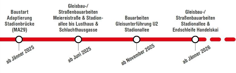• Nach der Hauptallee verläuft die weitere Trasse in der Meiereistraße. Die nächste Haltestelle ist beim Ernst-Happel-Stadion. Dort wird auch eine weitere Wendeschleife gebaut, die für den effizienten Abtransport nach Veranstaltungen im Stadion genutzt werden kann.