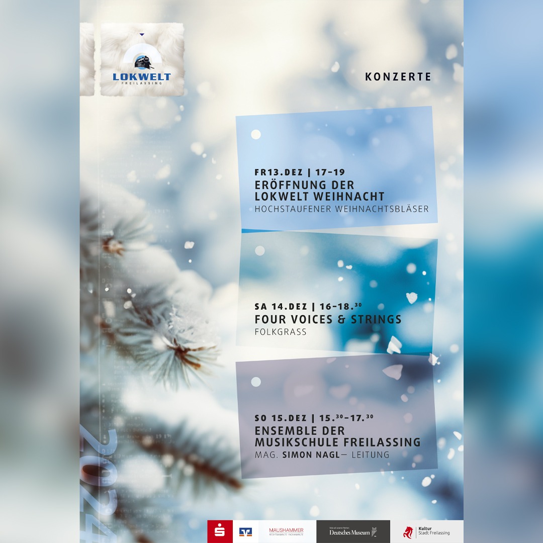 Die stimmungsvolle Lokwelt-Weihnacht bietet jeden Tag ein feines Konzert. Am Freitag begleiten die „Hochstaufener Weihnachtsbläser“ die Eröffnung, am Samstag gibt sich des großen Erfolges vom Vorjahr wegen „Folkgrass“ die Ehre und am Sonntag erfreut ein Ensemble der Musikschule Freilassing unter Leitung von Mag. Simon Nagl die Gäste.