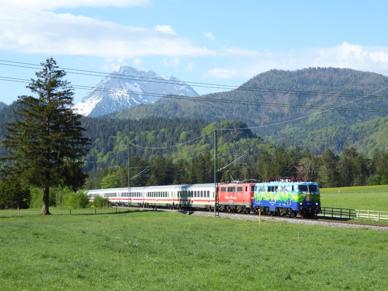 Vor der grandiosen Kulisse der Berchtesgadener Berge beginnt der IC „Königssee“ seine lange Reise an die Alster – mit 111 074 + 111 067 bei Winkl; 2. Mai 2025