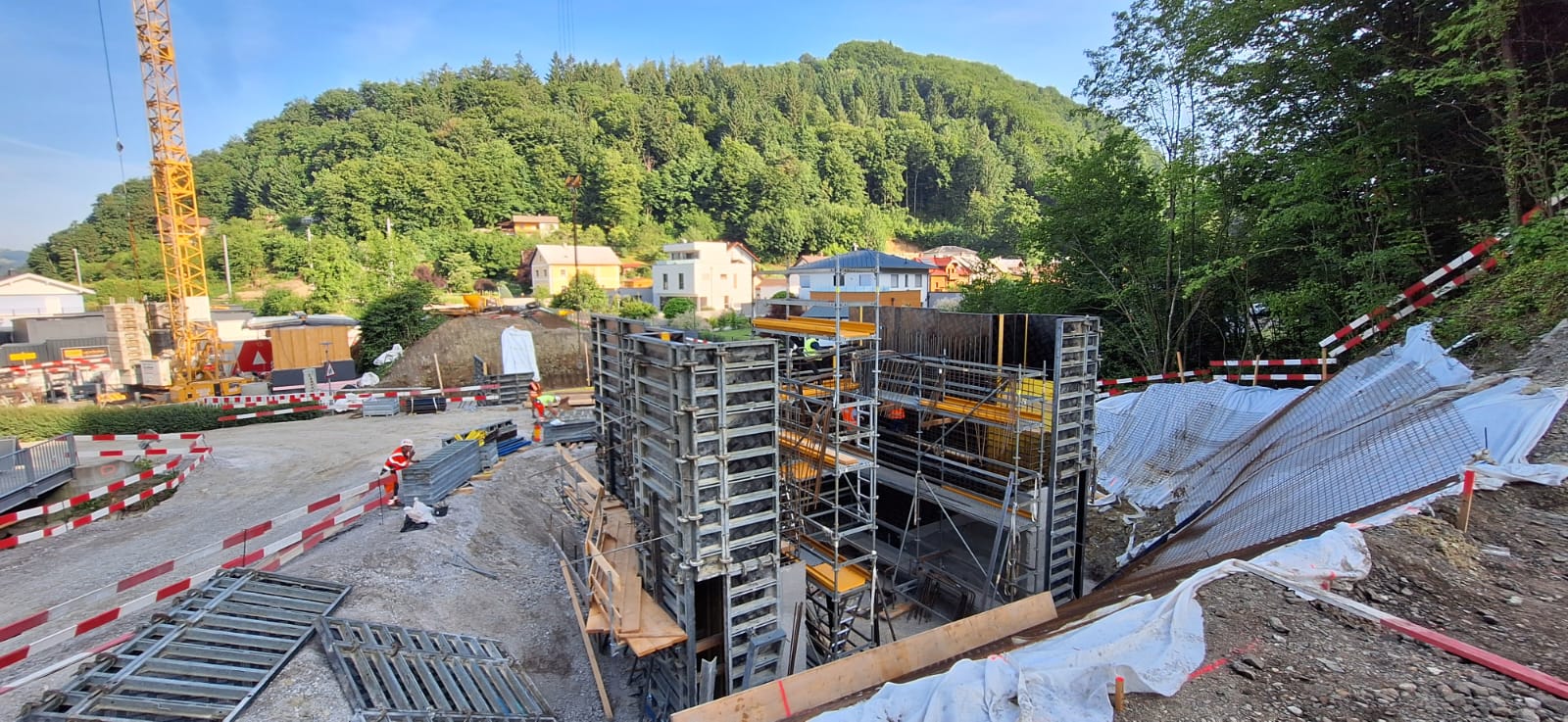 Das Brückentragwerk Wiesenfeld–Schwarzenbach wird voraussichtlich Ende Juli 2025 eingehoben und fertiggestellt.