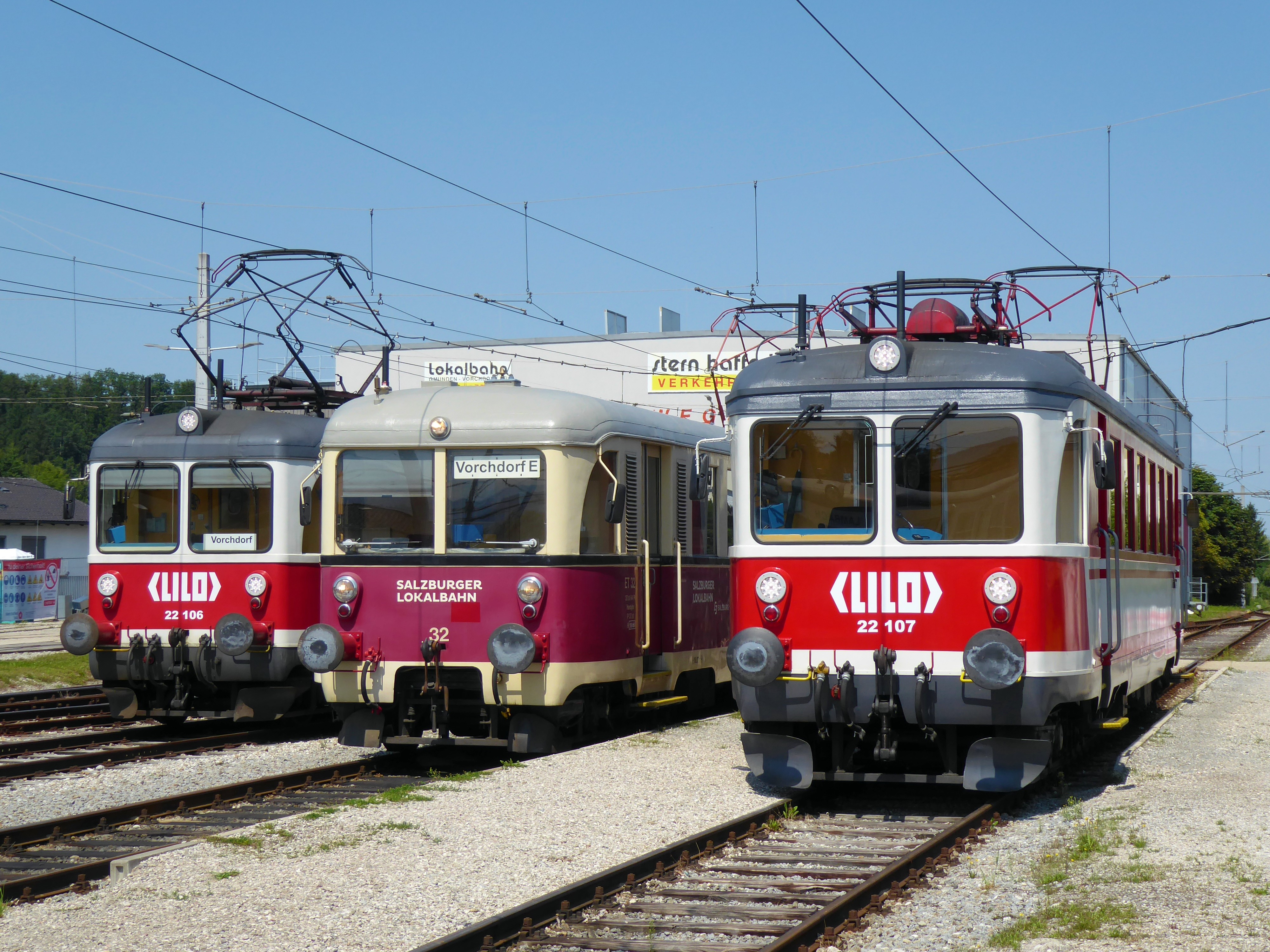 v.l.n.r. : ET 22.106 (Leihtriebwagen der Linzer Lokalbahn); ET 20.114 (vulgo SLB ET 32; Leihtriebwagen der Salzburger Lokalbahn) und ET 22.107 (Leihtriebwagen der Linzer Lokalbahn) im Bf. Vorchdorf-Eggenberg.