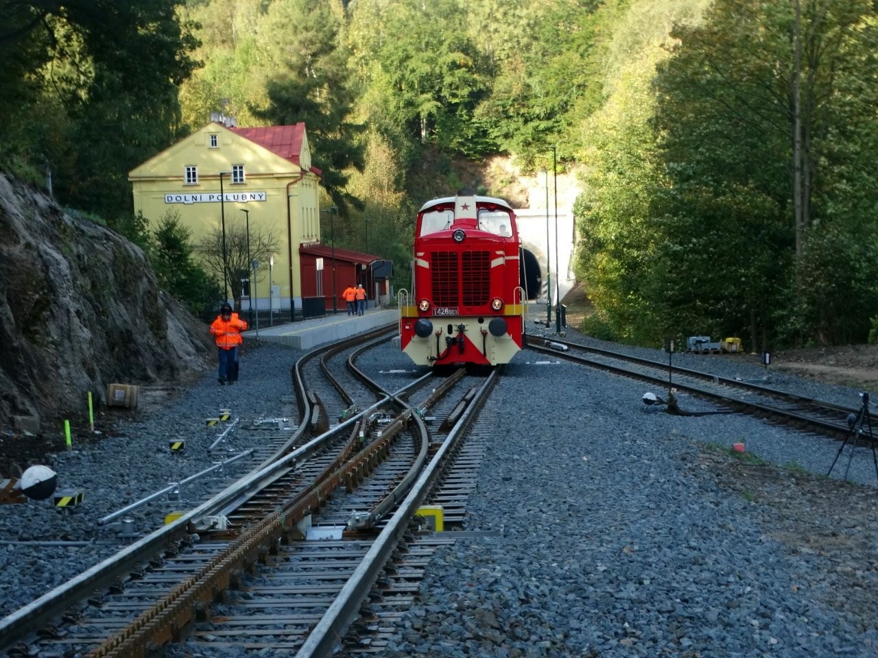 „Am 2. Oktober fand auf der Strecke Tanvald–Kořenov eine weitere Probefahrt mit der Lokomotive der Reihe 715 (in den 1960er-Jahren von SGP in Österreich hergestellt und auf der Erzbergbahn getestet) statt. Ziel war die Überprüfung der Funktionalität von drei speziellen Zahnstangenweichen mit einem Abt-Zahnstangensystem, die wir entworfen, gefertigt und geliefert haben.